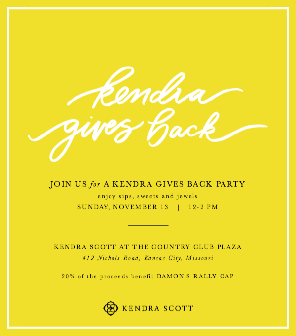 On Sunday, Nov. 13, Damon’s Rally Cap Charity teamed up with Kendra Scott on the Country Club Plaza in Kansas City for a special charity event – Kendra Gives Back. Representatives from Damon’s Rally Cap were on site from noon–2 p.m. to help spread awareness and answers any questions about the charity. Kendra Scott donated 20 percent of jewelry sales during that time to Damon’s Rally Cap, which totaled more than $560. Thank you to all of our supporters who stopped by or placed phone orders! |