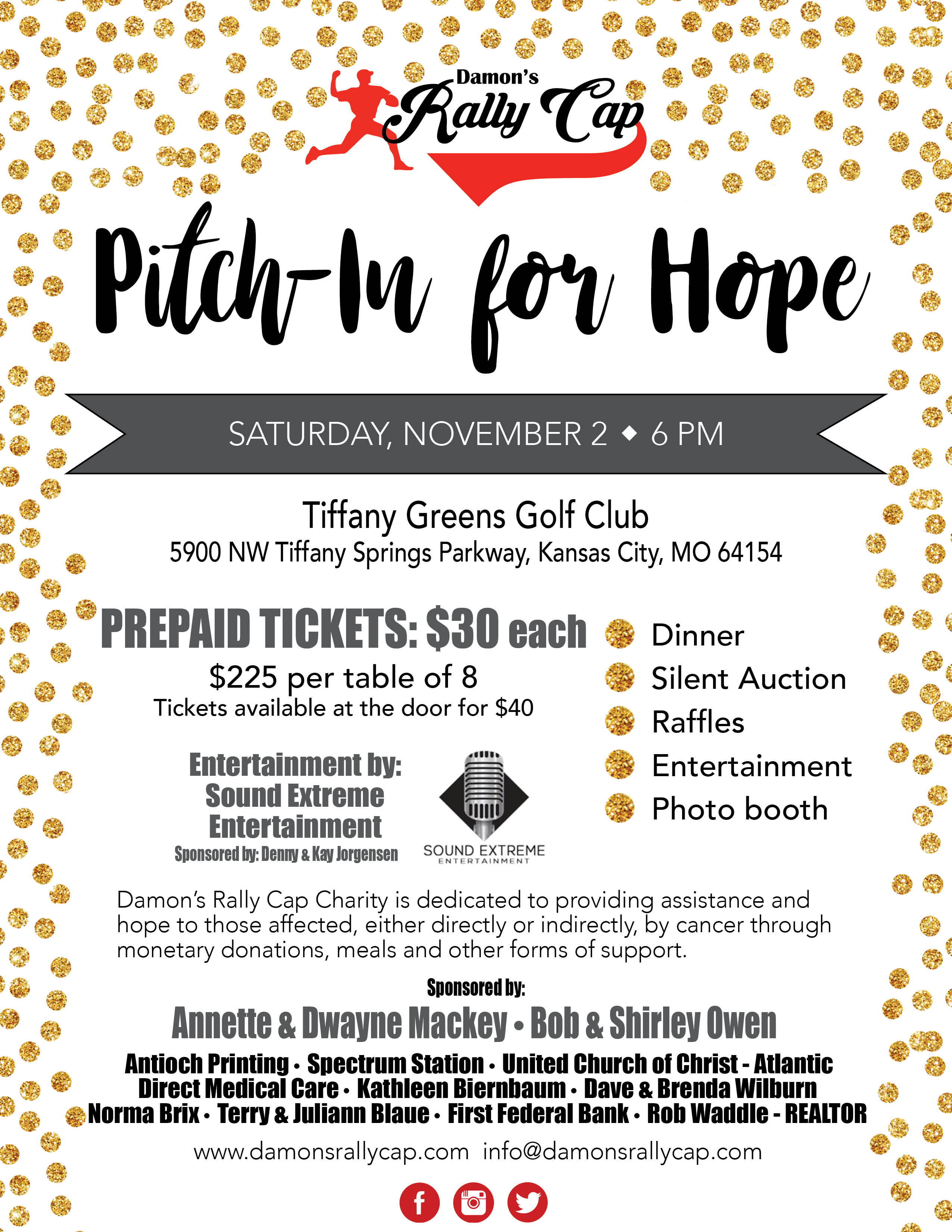 On Nov. 2, Damon’s Rally Cap held its annual fundraiser, Pitch-in for Hope, at Tiffany Springs Golf Club in Kansas City, Mo. More than 150 attendees – including past Damon’s Rally Cap recipients – enjoyed an evening of fundraising complete with a catered dinner, raffle drawings, a silent auction, photo booth and entertainment by Sound Extreme Entertainment.